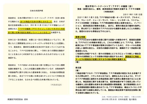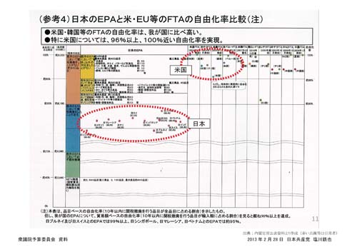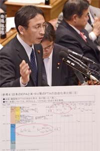 TPPのもととなるP4協定(原加盟国=4カ国の協定)では、原則として全ての品目について即時または10年以内に関税撤廃と規定している。100%近い「自由化」、関税撤廃が迫られる。重要品目を(TPP交渉の)入り口で除外する担保はあるのか――と追及。安倍首相は「入り口で除外する担保は共同声明の中にはない」と認めた。