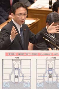 巨大地震による過酷事故の危険性を指摘し、対策もないと追及した日本共産党の吉井英勝議員の質問主意書(06年)に当時の安倍内閣が「万全を期している」と答弁していた。過酷事故は起こらないという歴代自民党政権の対応が事故につながった。反省なしに今後の対策はありえない。首相は「安全神話に陥っていたことを深く反省する」と述べた。