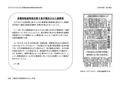 同規定は1997年の消費税5%増税時に、大手小売業者の「消費税還元セール」で、納入する中小事業者に買いたたきなどのしわ寄せが行われたことを根拠としている。当時、消費税を価格に転嫁できない実態に対処したのか。