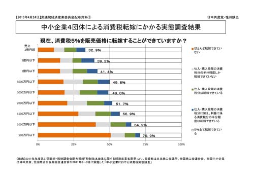 日本商工会議所や全国商工会連合会など4団体の実感調査で「消費税を転嫁できていない」との回答が半数を占めている。