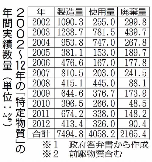 1960年代から毒ガスを製造していたとする証言や文献資料などをあげ、毒ガスの製造開始時期がさらにさかのぼる可能性があった。開始時期を明らかにするよう求めていたが答弁書では、2002~12年の製造・使用・廃棄・最大保有量などの実績値を初めて公表(下表)。過去11年間に製造された特定物質は全11種類にのぼっている。