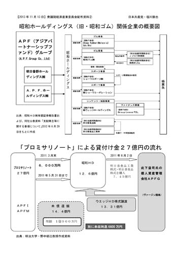 具体例として、アジア・パートナーシップ・ファンド(APF)に経営権を掌握された昭和ゴム(現・昭和ホールディングス)で、会社資産の約3割が流出してAPFグループ企業に還流させた疑いや、労働組合への不当労働行為が繰り返されている問題を取り上げた。