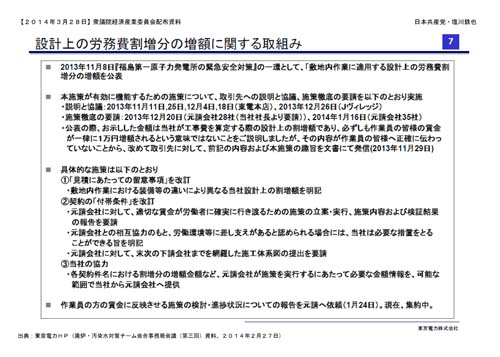 広瀬社長は元請け会社に対し、末端の一人ひとりにまで行き渡る対策を立案させ、東電もその実現に協力するとし、元請けとのすべての書面契約において増額分を別枠で明示していきたいと述べた。