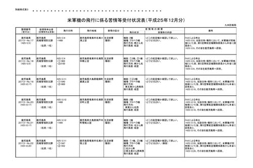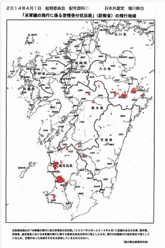 示したのは、「手を伸ばせば届くようなところを夜の決まった時間に定期便のように飛ぶ」(大分県豊後大野市)などの住民証言や、「米軍機飛行の苦情集計」(防衛省)の上位自治体。九州上空に、新たな訓練ルートが設定されたのではないか、とただした。