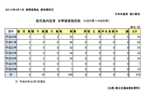 奄美群島で昨年春ごろからオスプレイの低空飛行が行われるようになったという住民証言や、奄美空港ではこの6年余りで米軍機が249回着陸している事実があり、まるで米軍基地。中止を求めるべきだ。