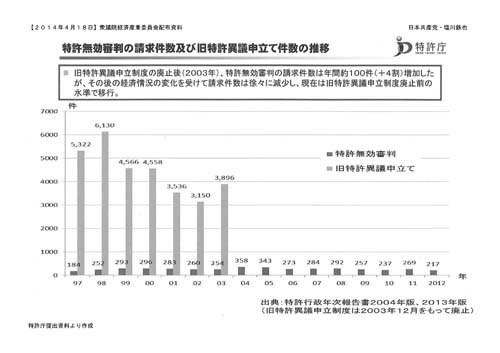 異議申し立て制度は廃止前、年間3000~6000件の請求があったが、無効審判への一本化後は年間200~300件程度にとどまり、結果として国民に負担を強い、権利行使を制約するものになった。廃止したことは不適切だったのでないか。