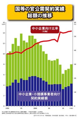 官公需の契約実績について、中小企業向け比率が大きく上昇している(↓下記パネル「国等の官公需契約実績総額の推移」グラフ)。割合が上がったのは、中小企業に仕事が回ったからではなく、WTO政府調達協定の適用基準額以上の契約を除いたために、分母が小さくなっただけだ。