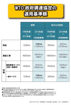 WTO政府調達協定は、政府調達の適用基準額などを定め、外国の産品やサービス供給者にも国内への参入を可能にする国際的な取り決め。