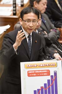 内閣官房の民間企業出身者のほとんどが非常勤職員だとし、その給与など勤務条件について質問。石原伸晃経済再生相は、週5日、午前10時から5時間45分の勤務で、目安では日当が1万円前後だと答えた。