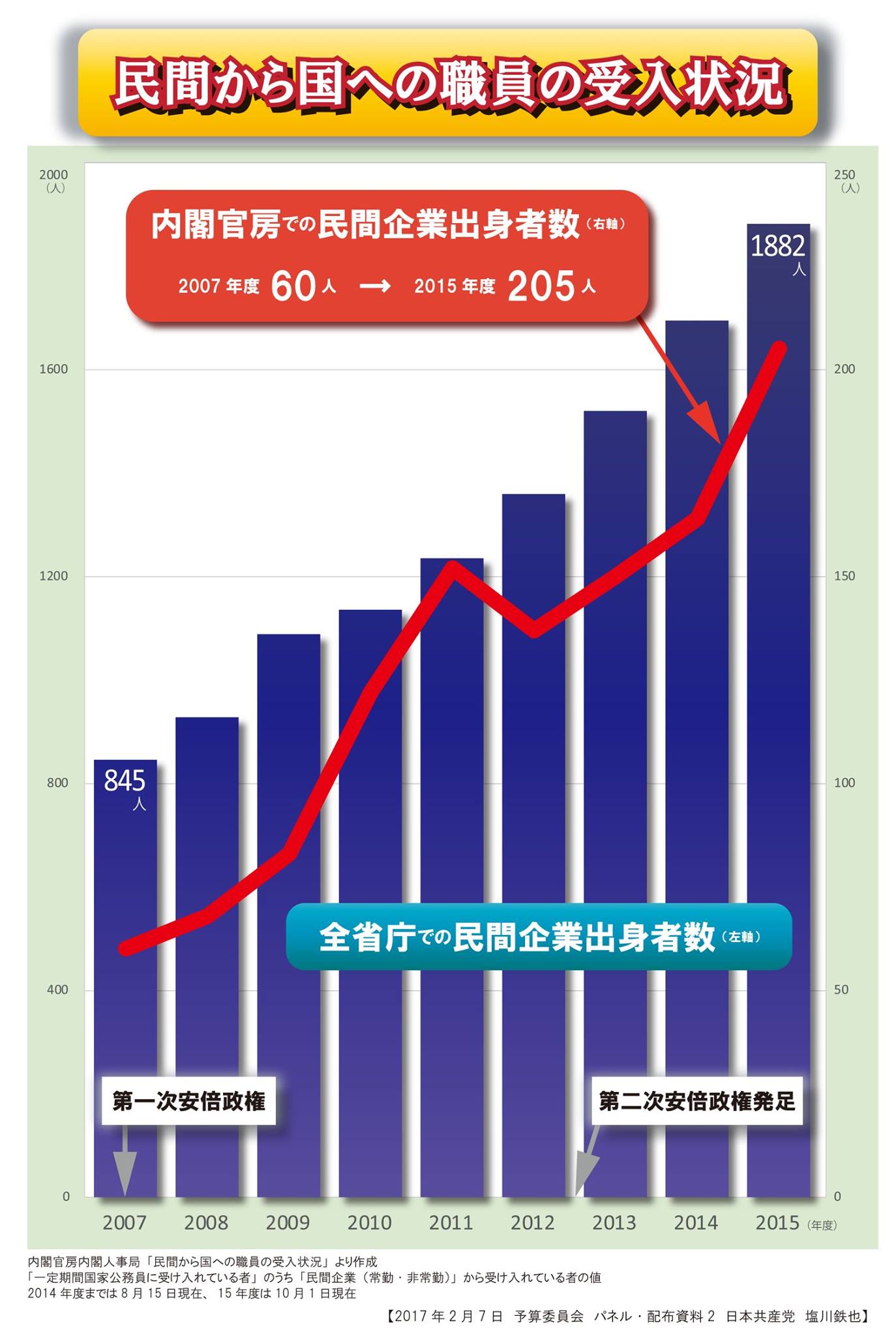 政策立案の“司令塔”である内閣官房の事務局には、民間企業出身者数が07年度の60人から15年度の205人へと3倍以上に拡大しています。