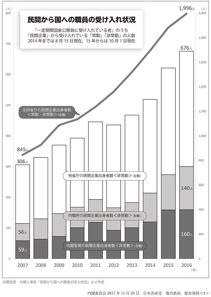 官民人事交流法では、元企業からの給与支給禁止などの規制が行われている。『即戦力』の非常勤職員は雇用が継続され、給与の差額分を元企業からもらっているのではないか――と指摘。官民癒着の規制に穴をあけていいのかと批判。