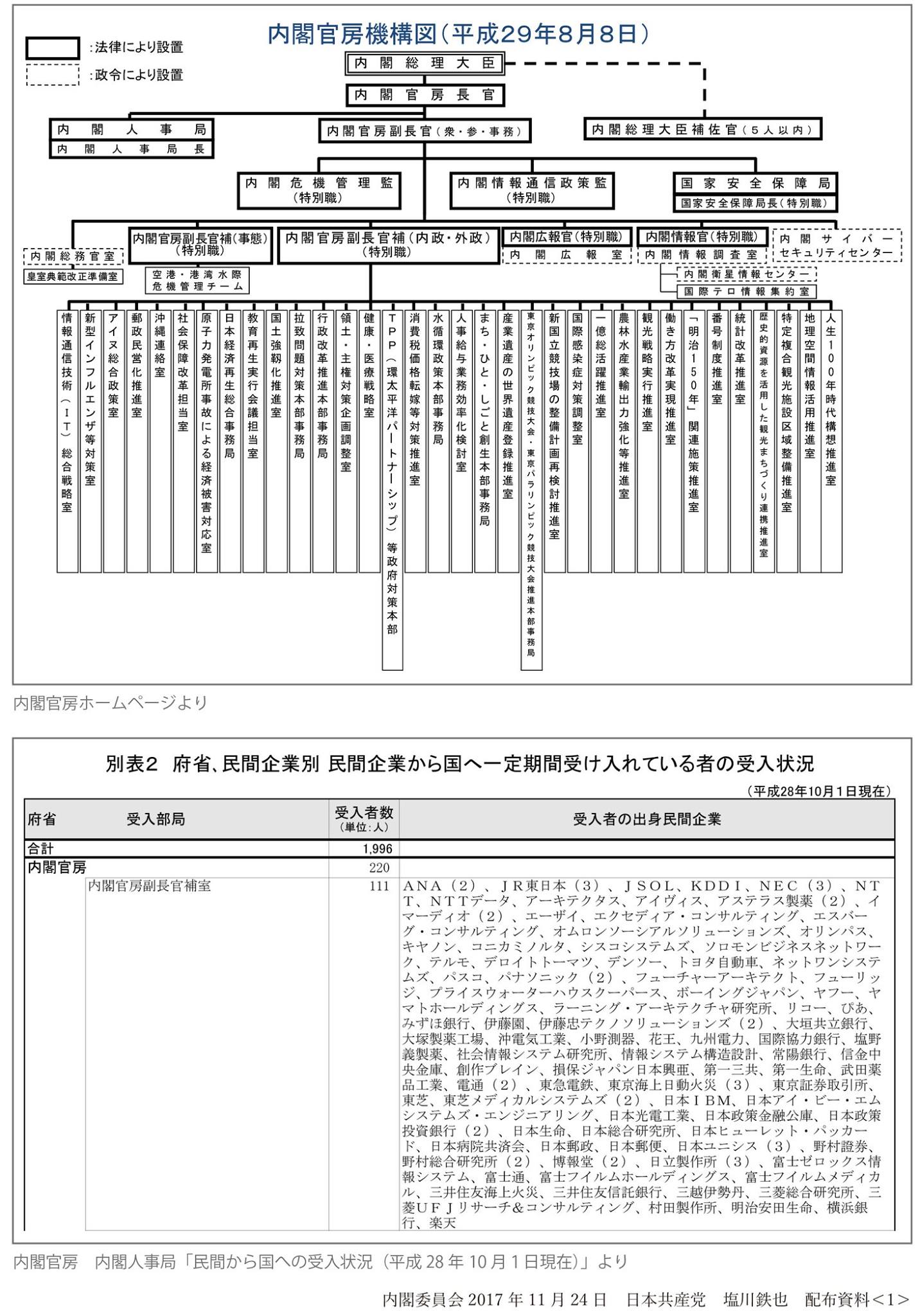 大企業などの民間企業出身者が国家公務員として勤務する「天上がり」について、内閣官房での増加を示し、財界奉仕の政治を推進する官民癒着の拡大だと追及しました。