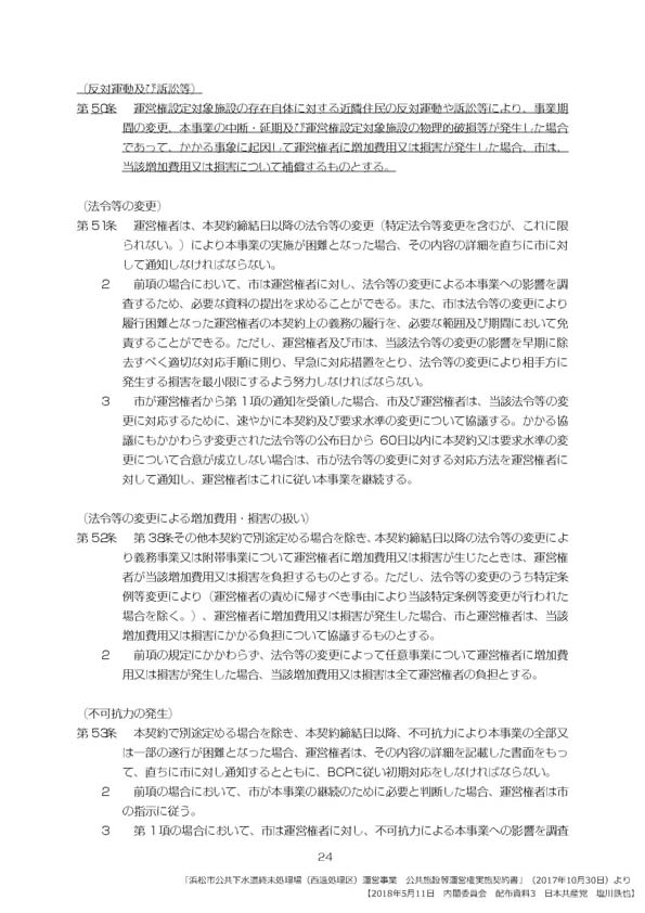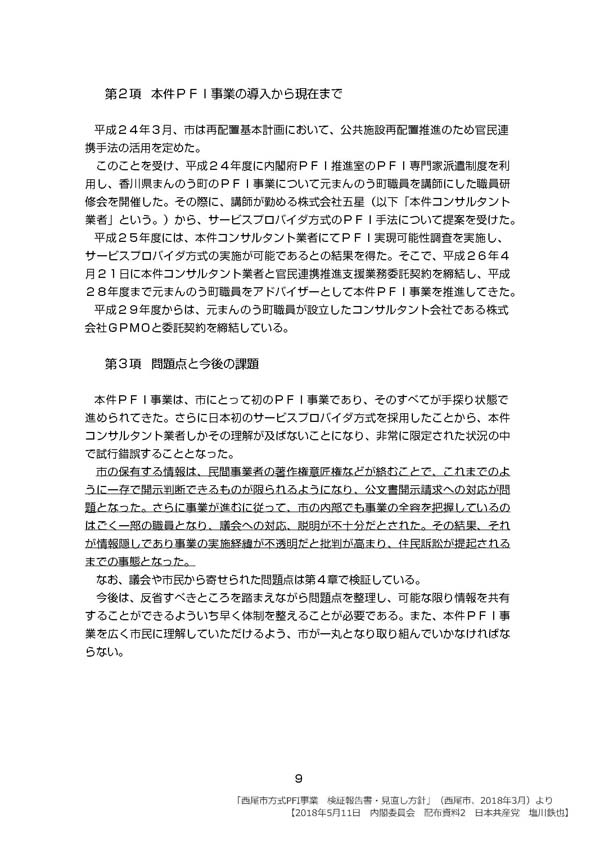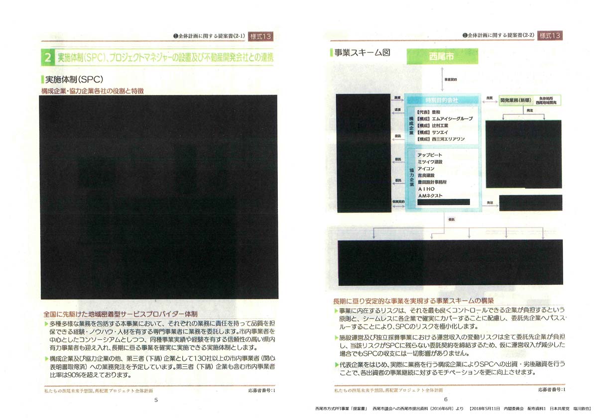 採決に先立つ質疑で、昨年からPFI事業の中止を含む大幅な見直しを行っている愛知県西尾市で、二年前の市議会に提出されたPFI事業の「提案書」が墨塗りだらけだったこと、西尾市が行った「PFI事業検証報告書」の中で「民間事業者の著作権意匠権が絡むことで、情報開示が制限された」と述べている。住民自治の観点から重大な問題だ。PFIが事業者の都合を優先するがために起こる情報開示の後退だ。