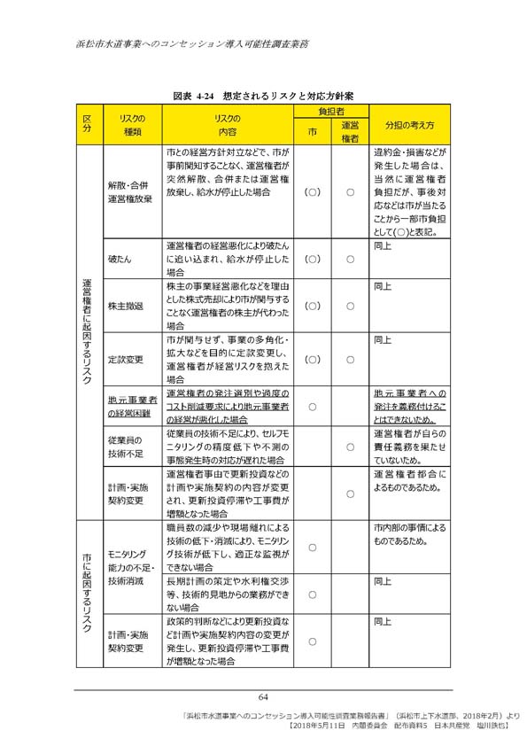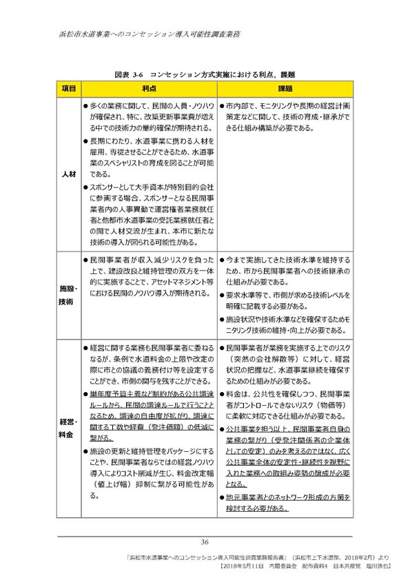 水道事業へのPFIコンセッション方式導入を進める静岡県浜松市が、内閣府からの全額補助で行った調査報告書の中で、コンセッション方式導入によって、地元事業者が排除されれば安定的・継続的な水道事業への障害となる懸念を指摘している、と質問。