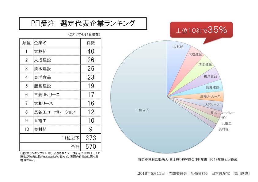 日本PFI・PPP協会作成の「PFI選定代表企業ランキング」では、ランキング上位は大手ゼネコンばかりで、上位10社だけで全体の35%を占める。結局、PFI事業は大企業の参入を促進し、地元企業を排除する仕組みとなっている。