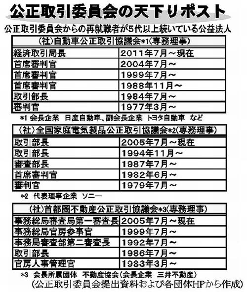 下請けいじめを是正できない構造的問題として、公取から業界団体への天下りがあると強調。自動車工業会会長が会長を務める自動車公正取引協議会など三つの公益法人の専務理事に、5代続けて天下りしているのが実態だ。