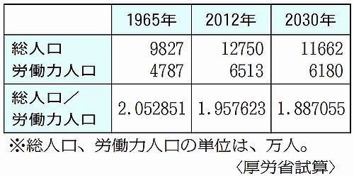 小宮山洋子厚労相は、労働力人口と全人口の比率は「1965年が2・05、2012年が1・96、2030年が1・89になる」と答え、将来にわたって比率が変わらないことを認めた。