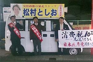 さいたま市見沼区内のスーパー前で街頭演説。松村としお埼玉1区候補と訴えました。