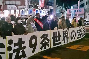 小山駅西口で、栃木4区の山崎としひこ候補と街頭演説。「憲法9条世界の宝」と書いた文字パネルを使って、にぎやかに宣伝です。