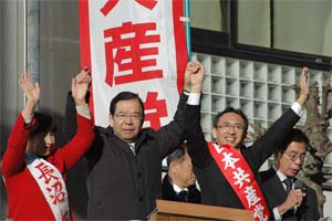 川越駅東口の街頭演説。志位委員長が訴えました。長沼ちね埼玉7区候補と一緒です。