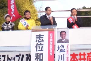 所沢駅東口。志位委員長と訴えました。辻もとみ埼玉8区候補と一緒です。歩道を埋め尽くす大きな人垣ができました。