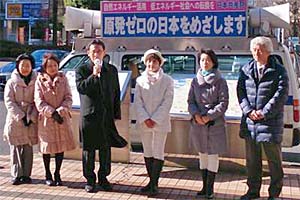 所沢駅西口で新年の街頭演説。柳下礼子県議、党所沢市議団の荒川広・平井明美・城下のり子・矢作いずみ議員と一緒です。