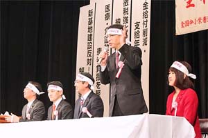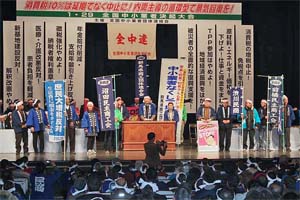 メインスローガンは「消費税10%は延期でなく中止に!内需主導の循環型で景気回復を!」。党を代表して山下よしき書記局長があいさつ。藤野保史、真島省三、倉林明子、梅村さえこ議員と一緒に決意表明。