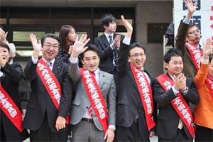 全日本金属情報機器労働組合(JMIU)の「安倍内閣の暴走を許すな!春闘勝利JMIU中央行動」国会請願デモを激励。