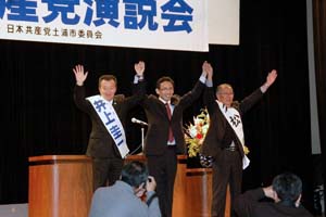 茨城県土浦市の党演説会。いっせい地方選挙の土浦市議選では、多数激戦が予想されるなか、現有2議席確保をめざします。30年以上にわたって市民要求実現の先頭にたってきた久松たけし市議、古沢市議のあとをを引き継ぐために全力を挙げている井上圭一さんと一緒に訴えました。