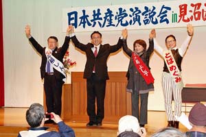 さいたま市見沼区の党演説会。県議選の青柳しんじさん、さいたま市議選の戸島よし子市議、とばめぐみさんと一緒に訴えました。