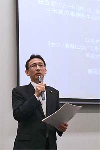 日弁連主催の「カジノ解禁について考える」院内集会に参加、あいさつしました。畑野君枝議員、清水ただし議員も参加。
