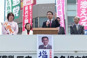 茨城県の取手駅東口の街頭演説会。市長選予定候補の高木あきらさん、市議予定候補の小池えつ子さん、上野たかし県議と一緒に訴えました。