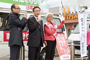 上福岡駅前。埼玉県議選の前原かづえ候補(ふじみ野市・三芳町、定数2)の応援です。