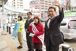 通りかかった女性が「もう自民も民主もダメ。共産党しかないわよ」と駆け寄ってくるなど、有権者の皆さんの激励がうれしい限りです。