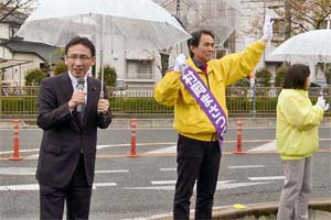 川口市内で村岡まさつぐ県議候補の応援演説。冷たい雨の中でもたくさんの人が駆けつけてくれました。