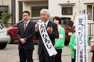 1議席増の6人の議員団めざす所沢市議選。党市議団の大黒柱、8期32年の豊かな実績と経験をもつ荒川広候補の応援に。