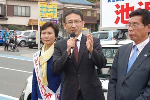多数激戦の川越市議選。池浜あけみ候補の応援です。日本共産党は1議席増の5議席をめざします。