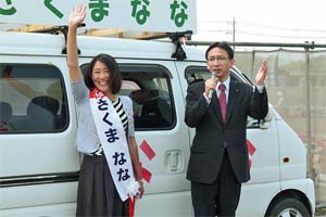 「平和を守る一票は、日本共産党へ」と、はつらつと訴えるさくま なな候補を押し上げてください!