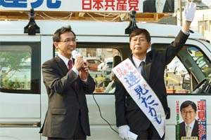 蓮見たかし市議候補と東松山駅前で訴えました。