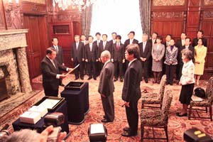 衆議院は、2014年ノーベル物理学賞を授与された赤崎勇名古屋大学特別教授と天野浩名古屋大学大学院教授の表祝行事を行いました(中村修二カリフォルニア大学教授は所用で欠席)。