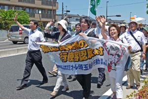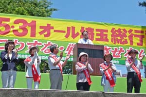 埼玉弁護士会、元自衛隊員、現役高校生のスピーチ。政党からは、日本共産党をはじめ、民主党、社民党がリレートーク。日本共産党を代表して、あいさつ。梅村さえこ衆院議員、埼玉県議団、おくだ智子参院比例予定候補らも参加しました。