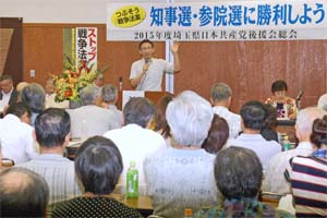 埼玉県日本共産党後援会総会であいさつ。昨年末の総選挙と4月のいっせい地方選挙の躍進で、意気高い総会でした。各地の後援会活動が選挙勝利に大きく貢献しました。来年夏の参院選勝利のために知恵を出し会う場となります。