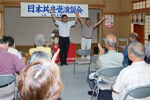 埼玉県越生町議選(定数11)に向けた日本共産党演説会。現職のかんべ光治議員が10期目をめざします。