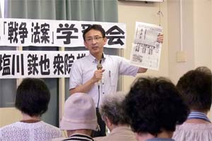 群馬県桐生市で戦争法案学習会。日本共産党の論戦が果たしている役割や国民の世論と運動が安倍内閣を追いつめていることを訴え。