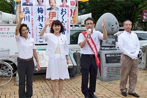 衆院本会議における戦争法案強行採決に抗議する緊急宣伝行動。浦和駅西口で梅村さえこ衆院議員、伊藤岳参院埼玉選挙区予定候補、奥田智子参院比例予定候補と一緒に訴え。