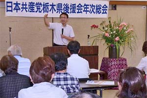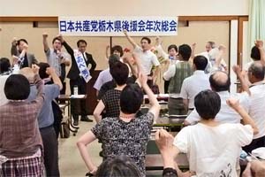 来年の参院選勝利とそれに先立つ中間選挙勝利めざし、鹿沼市議選のあべ秀実さんと大田原市議選の秋山ゆきこさんが決意表明。最後は意気高く「団結ガンバロウ!」