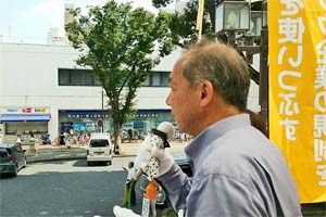 猛暑の中の埼玉県知事選。新所沢駅西口で柴田やすひこさんへの支持を訴えました。田中康夫・埼玉土建所沢支部長、伊藤岳・党県民運動委員長と一緒です。