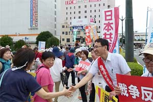 鹿沼の演説会の後、宇都宮へ。栃木県弁護士会主催の「平和憲法を守り戦争法案に反対する栃木県民パレード」の参加者を激励。