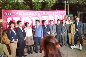 紙参議院議員、小池副委員長が代表してあいさつ。農業、地域経済、雇用、食の安全、医療、保険、知的財産権など日本国民の利益と経済主権を米国や多国籍企業に売り渡すことは許されません!秘密交渉での「大筋合意」など断じて認められない!