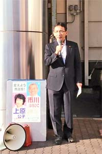 所沢市内で朝の駅頭宣伝。11日告示、18日投票で行われる所沢市長選挙。市川はるひこさん押し上げのためにがんばっています。